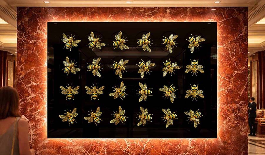 Инсталляция функционирует в двух режимах. В созерцательном состоянии она плавно генерирует композиции, перетекая от узора к узору и создавая атмосферу спокойной уверенности. При приближении зрителя «рой» оживает: пчёлы словно вступают в тихий диалог и начинают медленный, завораживающий танец. Возникает эффект личного приветствия — интеллигентный, сдержанный и по-настоящему премиальный.