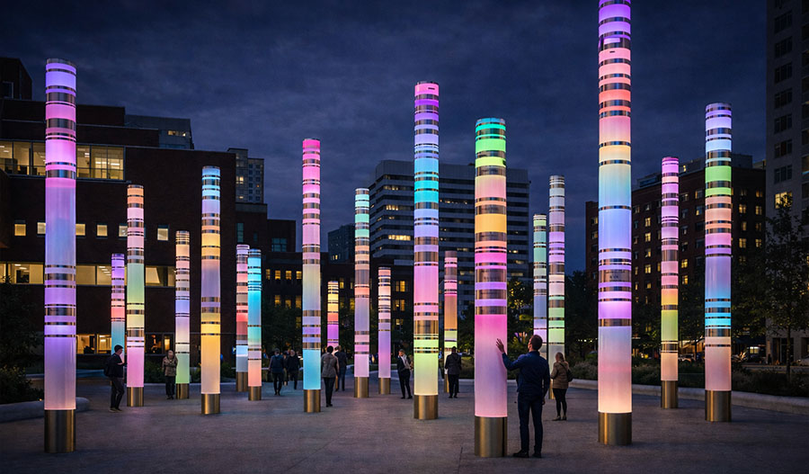 Each interaction is unique: light and sound change as if the column is “telling” its story in its own language. The space fills with a multilayered soundscape that reflects the rhythm, character, and emotional atmosphere of time.